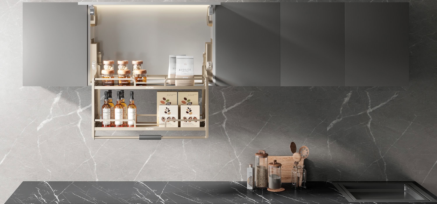 Double-layer structure, high space utilization rate ofmore than 85%, customized partitions for scientific storage, storage jars, cans, condiments, and kitchen utensils can be placed arbitrarily according to personal habits.