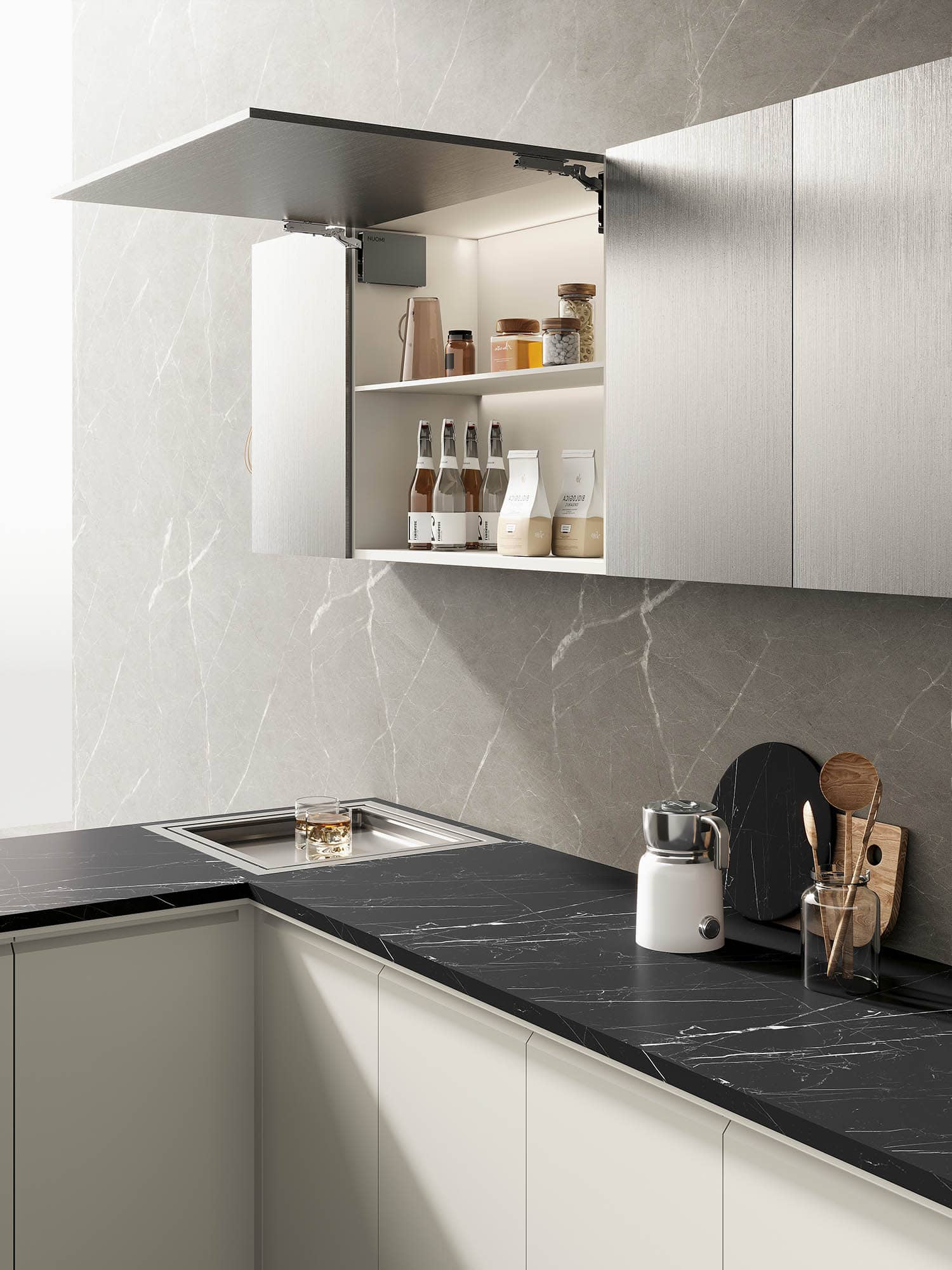 Flip-up lift system, simple, generous and high-grade. The built-in electric servo system ensures that the whole movement process is gentle and smooth, so as to form a light and easy opening and closing effect. Safe and stable operation, intelligent opening, make it more convenient to pick up andput items, and good products allow you to fnd the comfort and peace you haven’t seen for a long time in the bustling city.